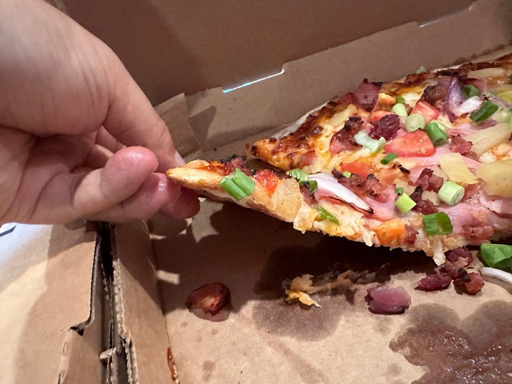 Ham, bacon, pineapple, tomatoes, red & green onions on Polynesian sauce (zesty red sauce upon request).